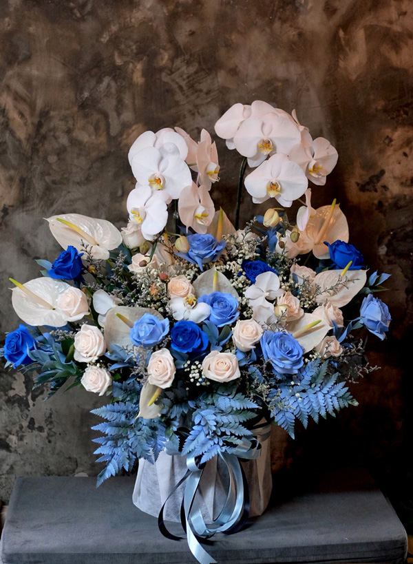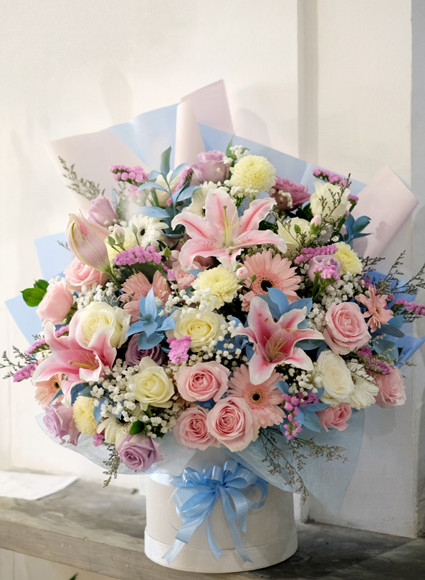 Flower Vase Bouquet is a beautiful arrangement with flowers blooming on the box, glass vase, basket or ceramic. You can add on chocolates, fruits, wine or teddy bear as well.